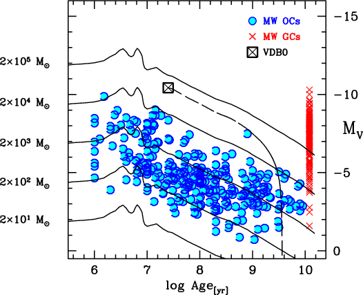 Conclusions. VdB0 is significantly brighter (1 mag) than Galactic open clusters of similar age. Its present-day mass and half-light radius (