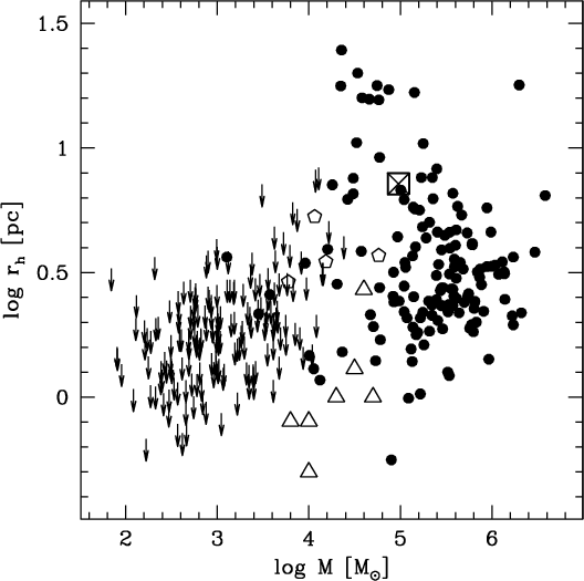 Thus, a picture has emerged that, rather than representing distinct entities, OCs, YMCs and GCs may represent regions within a continuum of cluster properties dependent upon local galaxy conditions (Larsen 2003). The lifetime of a star cluster is dependent upon its mass and environment. Most low-mass star clusters in disks are rapidly disrupted via interactions with giant molecular clouds (Lamers & Gieles 2006; Gieles et al. 2007). These disrupted star clusters are thought to be the origin of much of the present field star populations (Lada & Lada 2003). Surviving disk clusters may then be regarded as OCs or YMCs, depending upon their mass. Star clusters in the halo may survive longer since they are subjected to the more gradual dynamical processes of two-body relaxation and evaporation. The clusters which survive for an Hubble time - more likely to occur away from the disk - are termed GCs (see also Krienke & Hodge 2007). To date, no known thin disk GCs have been identified in the Milky Way.