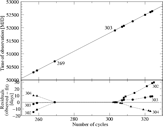 The 35 day modulation of the X-ray flux is generally explained by the precession of the accretion disk, which regularly blocks the line of sight to the X-ray emitting regions near the magnetic poles of the neutron star (Gerend & Boynton 1976; Schandl et al. 1994). With regard to the systematic variation in the shape of the X-ray pulse profiles, we follow Trümper et al. (1986), Shakura et al. (1998), and Ketsaris et al. (2000) in assuming that the responsible physical mechanism is free precession of the neutron star.