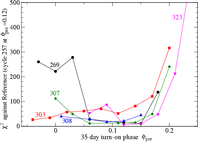 cycles at different 35 day phases to a template profile of cycle No. 257 at