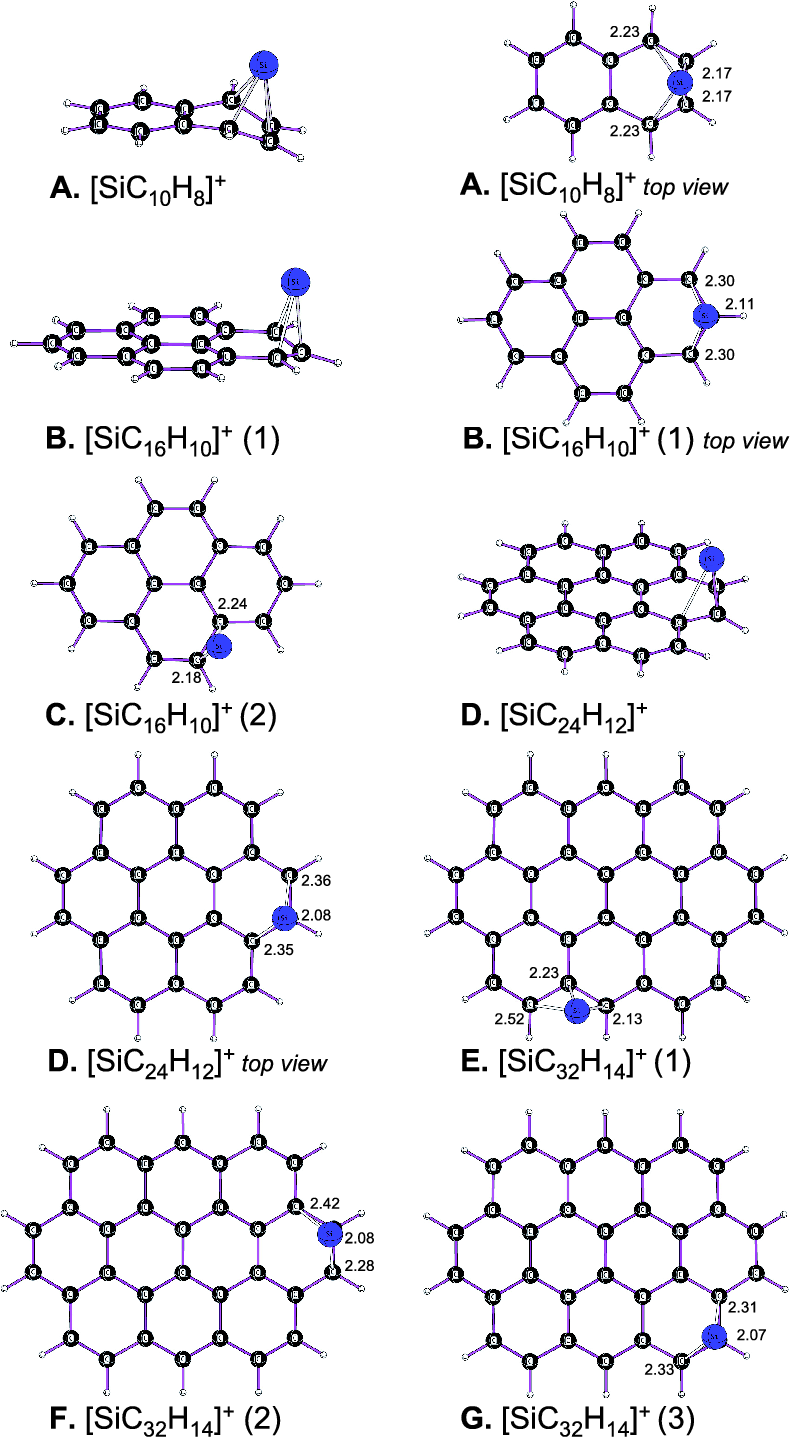 Figure 1: Lowest energy stable structures for the cationic complexes of Si with naphthalene C10H8 (structure A), pyrene C16H10 (structures B, C), coronene C24H12 (structure D), and ovalene C32H12 (structures E, F, G), optimized at the B3LYP/D95++** level of theory. The values expressed in Å indicated on each structure correspond to the Si-C bond lengths. |