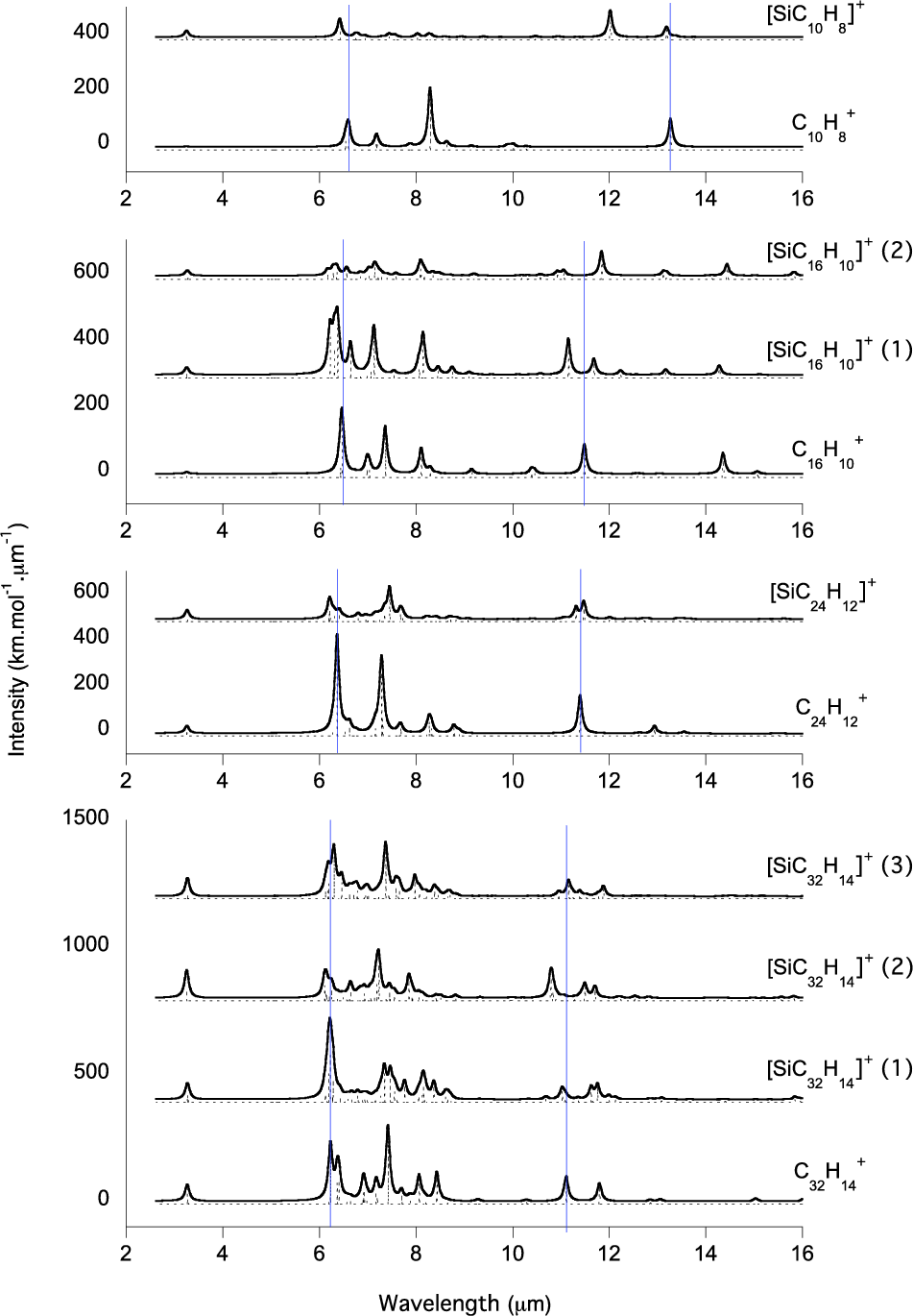 Not only Si is mainly present in its ionized form in the gas-phase of photodissociation regions (PDRs) where PAH0/+ are largely detected, but also the cationic complexed species are more interesting to study because of their higher stability. Therefore, only the spectral features of the latter species and their astrophysical implications are discussed in the following sections.