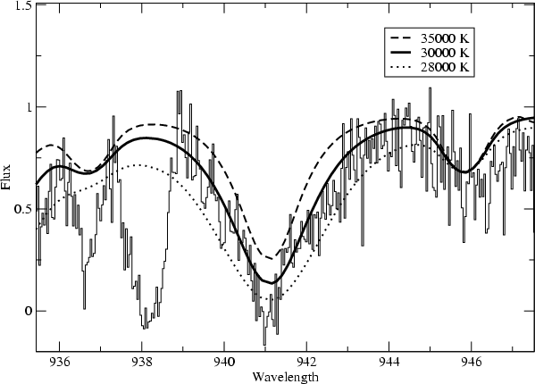 The intrinsic spectroscopic resolving power of FUSE is close to R=20 000 corresponding to a line spread function (LSF) width of 15 km s-1 (e.g., Sahnow et al. 2000; Hébrard et al. 2002; Kruk et al. 2002). The effective resolution depends on the quality of the individual exposure alignment. In particular, the alignment is difficult to assess for spectra in the SiC channels because of the smaller effective area as compared to the LiF channels, resulting in a lower signal-to-noise ratio. Misalignments reduce significantly the spectral resolution of the final spectrum so that we estimate the LSF width to be as large as