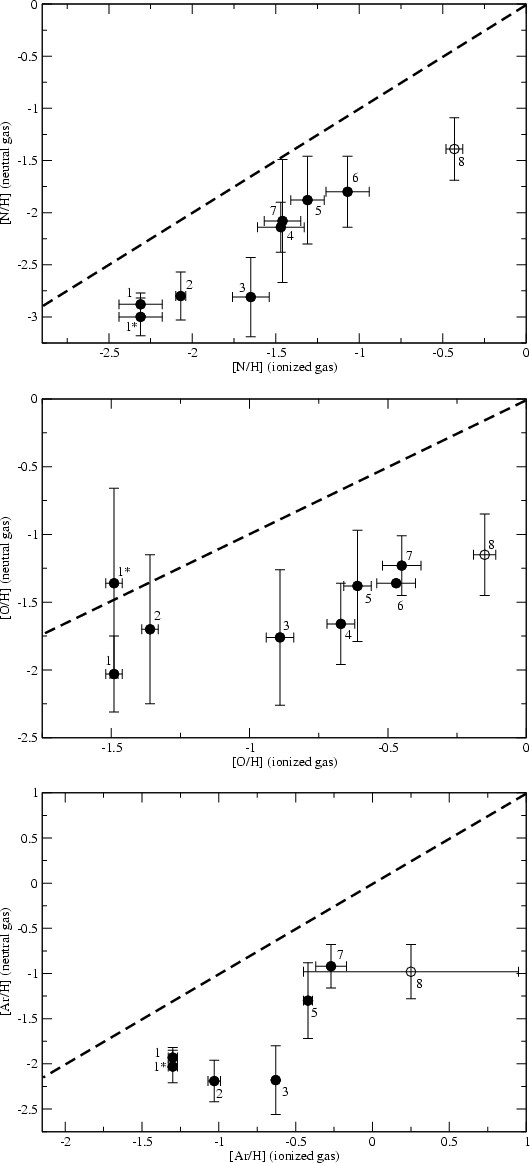 cm-2. Chemical abundances were then computed from the column densities using the dominant ionization stage in the neutral gas. Our abundances are compared to those measured from emission-line spectra in the optical, probing the ionized gas of the H II regions.