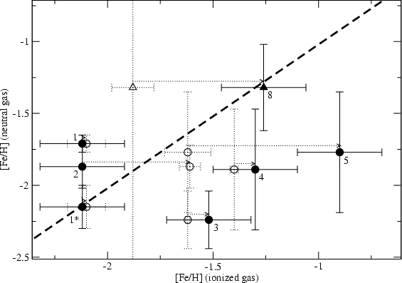 Elemental depletion is not problematic because of the low dust content along the selected lines of sight. In contrast, the ionized gas shows a clear depletion pattern, with iron being strongly depleted.