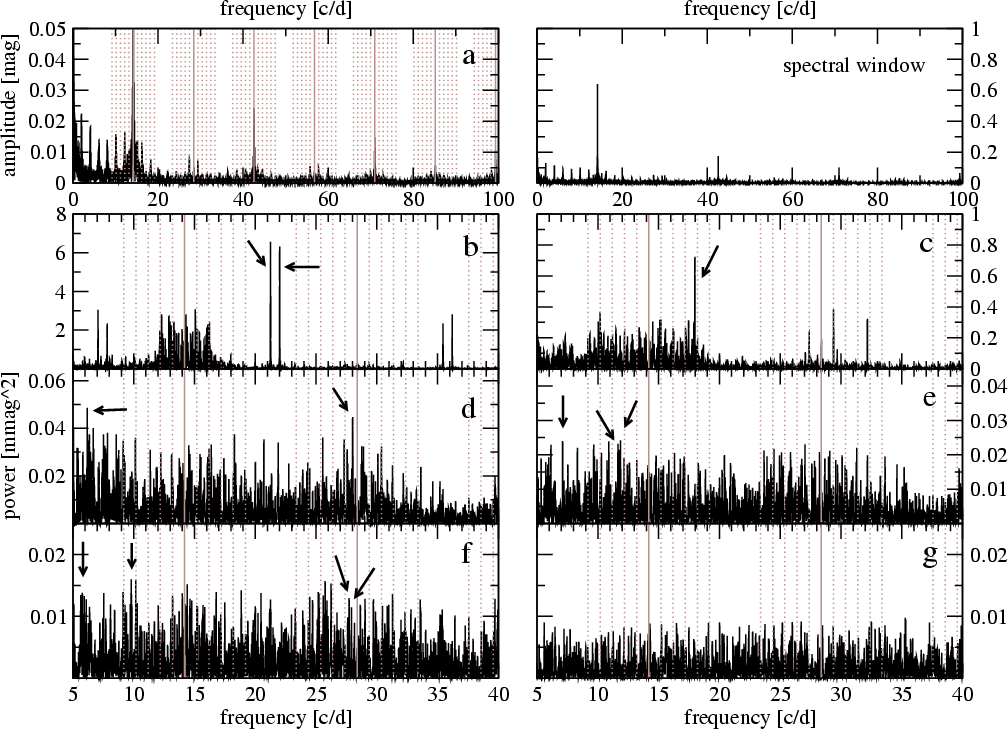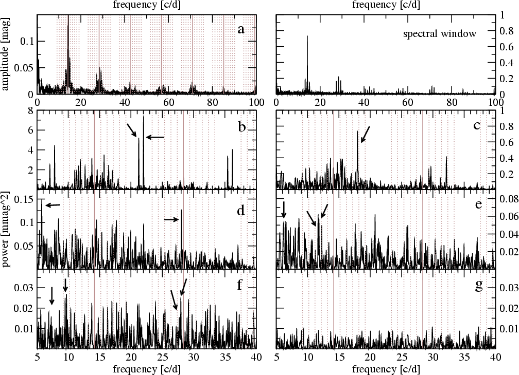 Figure 2: Frequency analyses of the 2006 MOST photometry of HD 142666. The amplitude spectrum is shown at top left (labelled ``a'') and the spectral window at top right. Panels ``b'' to ``f'' show power spectra where the identified pulsation frequencies are marked with arrows. Panel ``g'' ( bottom right) is the residual power spectrum after prewhitening of all 151 formally significant frequencies in the data. The solid grey lines mark the MOST satellite orbital frequency and its harmonics. The dotted grey lines are 1 d-1 sidelobes of these frequencies. Note the different scalings on the y-axes. |