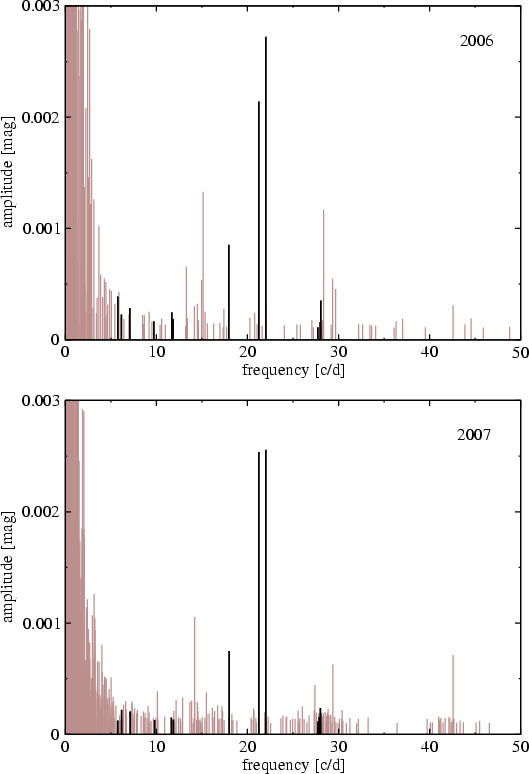 Figure 4: Significance spectra of the 2006 data ( top) and 2007 data ( bottom). Grey lines mark all formally significant peaks; black lines are the 12 identified pulsational frequencies common to both data sets. |