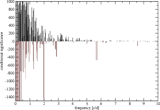 Figure 5: A closer look at the low-frequency domain of the results of the 2007 data analysis with CINDERELLA. The 2-d-1 frequency is known to be due to the gaps introduced in the HD 142666 time series. This and other peaks with negative values of their conditional significance are shown by grey lines. Peaks that appear only in the stellar light curve have positive conditional significance (black lines). |