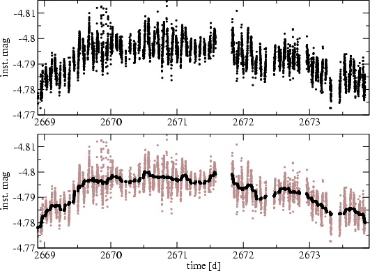 First, a frequency analysis of this 5-day subset light curve was carried out with SIGSPEC. Although this is the ``quietest'' part of the light curve, irregular variability is still clearly present. To reproduce the shape of the irregular light variations in this data subset, moving averages were computed. Using a time interval of 4 h for the boxcar allows one to smear out the pulsation effects deliberately, without significant suppression of the irregular variations. The bottom panel of Fig. 6 shows the subset light curve (grey dots) where the boxcar is overplotted (black dots).