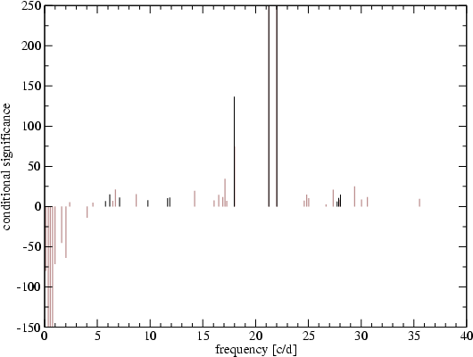The regularly spaced peaks between 0 and 14 d-1 visible in the amplitude spectrum are also present in the spectral window (top right in Fig. 3). The cause is gaps in the data due to interruptions to observe yet another high-priority MOST target of opportunity, monitored every half-day during the 2007 HD 142666 run. This regular spacing of 2 d-1 and its harmonics appear in the amplitude spectrum of the background light curve with even higher amplitudes. When submitting the star and the background light curves to CINDERELLA, these frequencies get negative conditional significances and are therefore rejected. Figure 5 shows the results of the analysis with CINDERELLA.