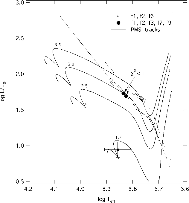 There are, though, several issues that need to be resolved. We need to understand why the best fitting models lie well away from the star's presumed location in the HR diagram. Possibly this could be due to the presence of the circumstellar disk, which makes photometric determinations of the star's luminosity and effective temperature highly uncertain. We also have to wonder why none of the frequencies fit are radial modes (i.e., l = 0). Most likely, our mode identifications and the specific model fit are not completely correct. For example, if the outer envelope and atmosphere of the models are slightly off, a reasonable possibility considering the amount of dust in the neighborhood of the star, then the higher-frequency modes that are sensitive to the outer layers of the model, will also be off. A model uncertainty of