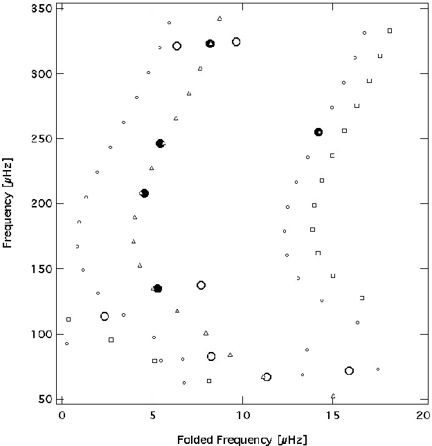 Figure 11: Echelle diagram of the model from the best model fit to the five frequencies f1, f2, f3, f7, and f9. Fitted frequencies are plotted as large filled circles, frequencies not used in the fit as large open circles. l = 0 modes are shown with small open squares, l = 1 modes as small open triangles, l = 2 and 3 modes with small open circles running parallel to the l = 0 and 1 modes, respectively. |