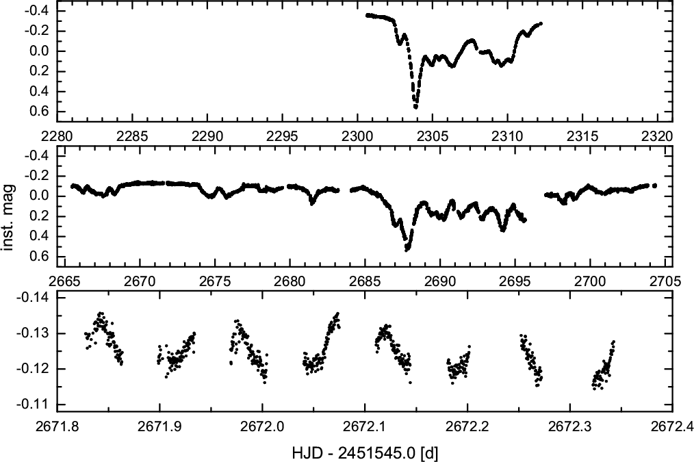 Figure 1: MOST time series photometry of HD 142666: 2006 observations ( top panel) and 2007 observations ( middle panel) on the same scale. A zoom into the 2007 light curve shows the pulsational variability ( bottom panel). |