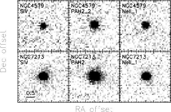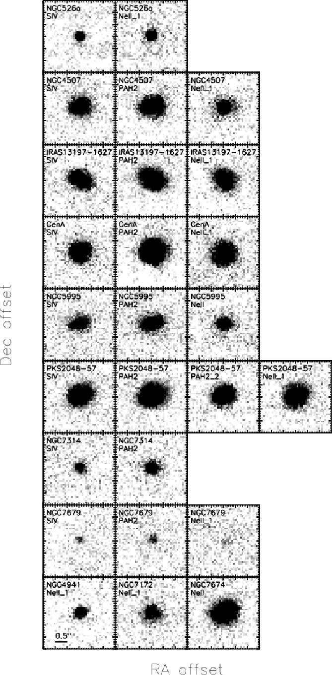 all the nuclei of our observed sources are point-like, except for 2 objects whose extension is likely of instrumental origin. For 3 objects, however, we observed additional extended circumnuclear emission, even though our observational strategy was not designed to detect it. Comparison of the VISIR photometry and Spitzer spectrophotometry indicates that the latter is affected by extended emission in at least 7 out of 19 objects and the level of contamination is