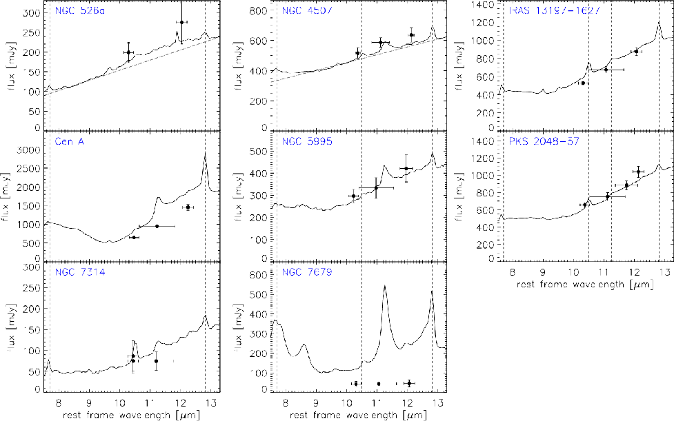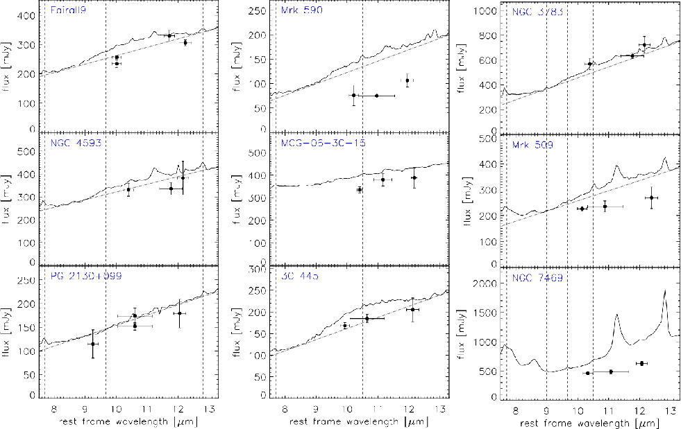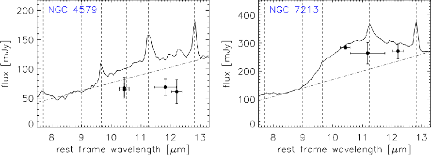 Neither the results of Schweitzer et al. (2008) nor our own rule out additional silicate emission from the torus itself. As the emission features seen in Fig. 9 are weak to begin with, however, the torus emission has to be low, especially when compared to prominent silicate absorption features as in e.g. Cen A or NGC 5995. The weakness of the feature is a strong argument in favour of clumpy torus models since these predict a less pronounced feature than smooth ones (see Nenkova et al. 2002; Hönig et al. 2006).