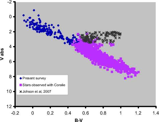 Figure 1: Observed stars in an HR diagram. We also plotted the dwarfs and/or (sub-) giants surveyed either with the Coralie spectrograph or by Johnson et al. (2006). Our targets cover a domain that has not been surveyed yet. Note the relative lack of objects in the [0.2; 0.4] B-V region, due to selection effects (see text). |