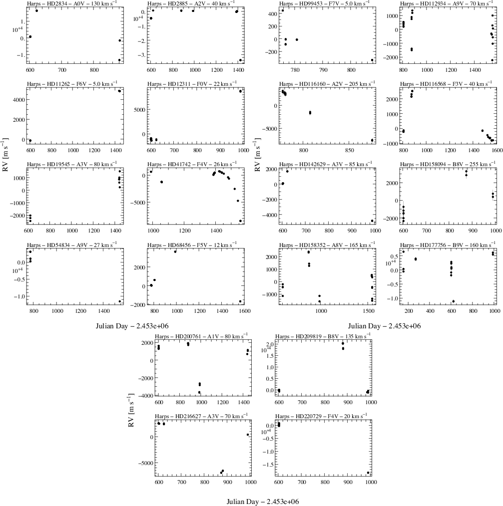 Doradus type stars (from Mathias et al. 2004 and http://astro.univie.ac.at/dsn/gerald/gdorlist.html) were also removed because they are known to produce RV variations over hours to a few days due to pulsations. Finally we also removed Ap and Am stars, which present spectral anomalies and are often associated to binary systems. This removes a number of late A - early F type stars, crossing the