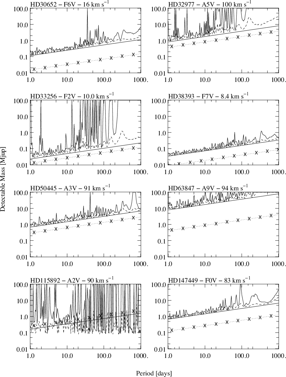 (Galland et al. 2005a): the detection limit of stars with ST earlier than B8 does not fall into the planet domain. Our survey is also volume-limited with an upper limit at 67 pc for the B8-A9 dwarfs and at 33 pc for the F0-F7 dwarfs. The distance was taken from Hipparcos catalog, and stars with distance uncertainties over 20