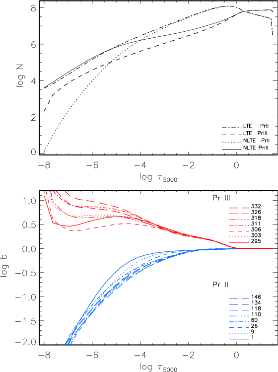 In the range of stellar parameters in which we are concerned, there is no need to include the highly excited levels of Pr III in the model atom. They play a minor role in the population and depopulation of Pr III, because the next ionization stage Pr IV represents a negligible fraction of the Pr abundance. We, therefore, use the levels of the odd