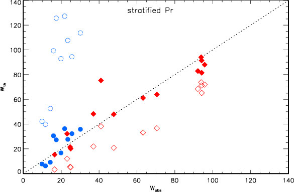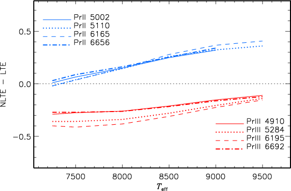 The 15 788 and 392 radiative bound-bound transitions in Pr II and Pr III, respectively, are included in SE calculations. Oscillator strengths fij based on laboratory measurements of Lage & Whaling (1976) or estimated from the observed line intensities of Meggers et al. (1976) are available only for 448 transitions in Pr II. They originate in the Kurucz & Bell (1995) linelist and are accessible via the Vienna Atomic Line Data Base ( VALD, Kupka et al. 1999).