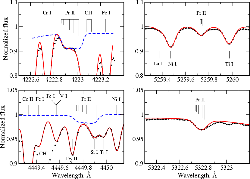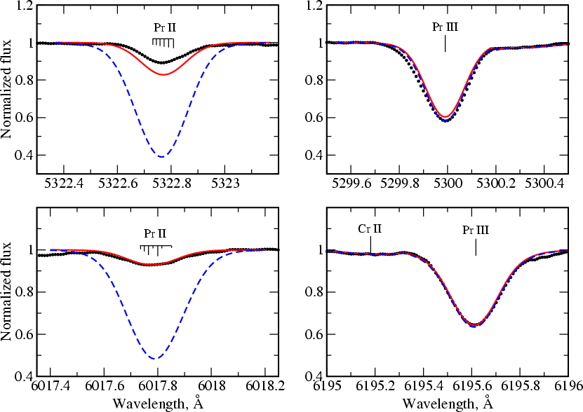 2 dex). We find that the lines of both ionization stages are fitted for the vertical distribution of praseodymium, where the Pr enriched layer with [Pr/H]