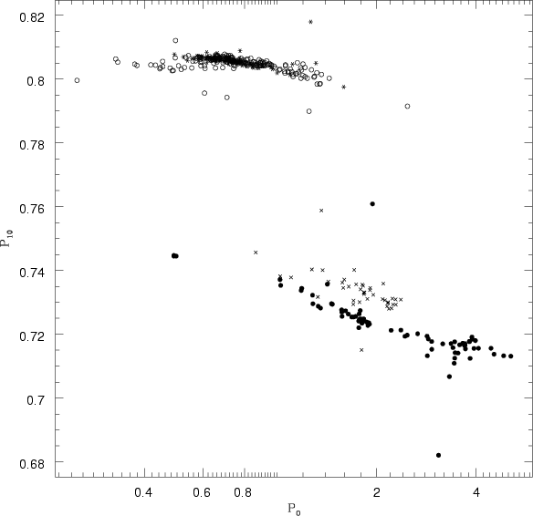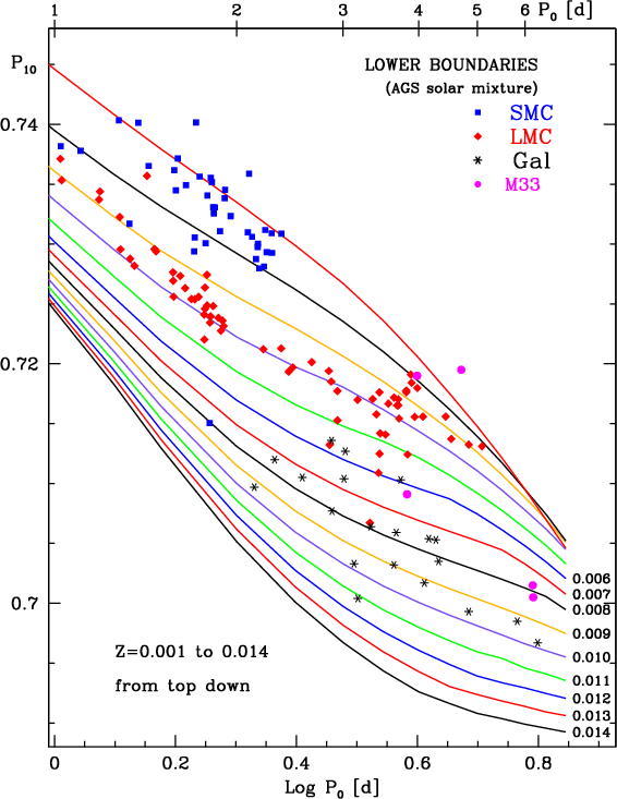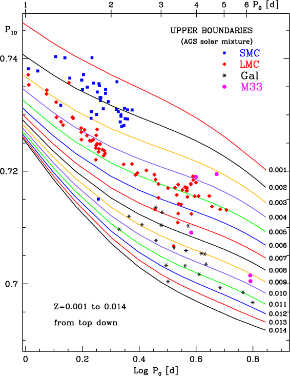 In Fig. 7 we show the derived Z values as a function of log P0. The error bars reflect the consequences of using the linear criterion for beat behavior, i.e. simultaneous instability in the fundamental and first overtone modes. A comparison of Figs. 4 and 5, which show the upper and lower boundaries of P10 as a function of Z, indicates that the uncertainties in Z become very large for the longer-period BCs. It is indeed well known that the linear BC criterion is far too relaxed, so that real BCs occupy only a subregion of the corresponding parameter space (Buchler & Kovacs 1986; Stellingwerf 1974).