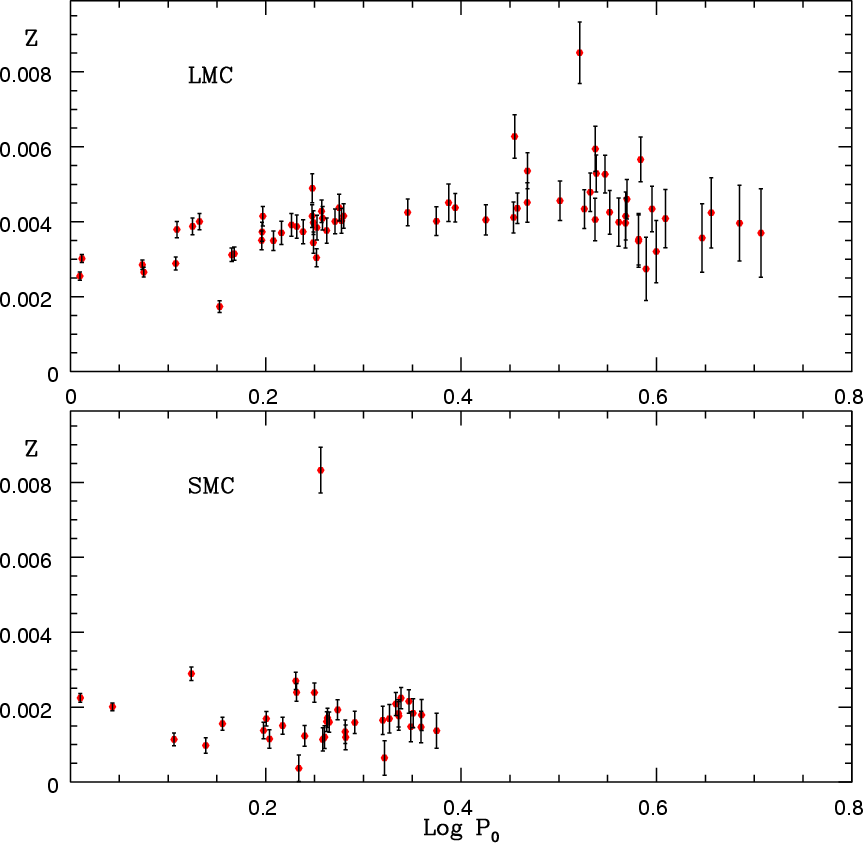 . The studies listed above clearly established that the period ratio (higher to lower mode) of the FO/F pulsators is around 0.72, while that of SO/FO objects is near 0.80. For the FO/F pulsators it is well known that the period ratio depends on the metallicity Z, as seen e.g. in the Petersen diagram (Petersen 1973) of the period ratio vs. the period of the lower mode. From OGLE photometry and stellar atmosphere models, Kovács (2008) showed that, in both Clouds, the average metallicity of FO Cepheids is lower than those pulsating in the fundamental mode.