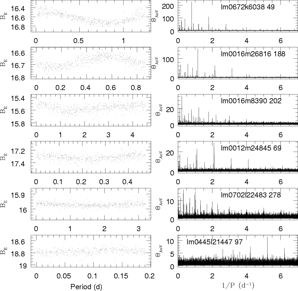 Folded light curves and corresponding periodograms of 6 typical LMC BCs, alternately FO/F and SO/FO objects, from the most significant ( top) to non-significant secondary modes ( bottom). Left: |