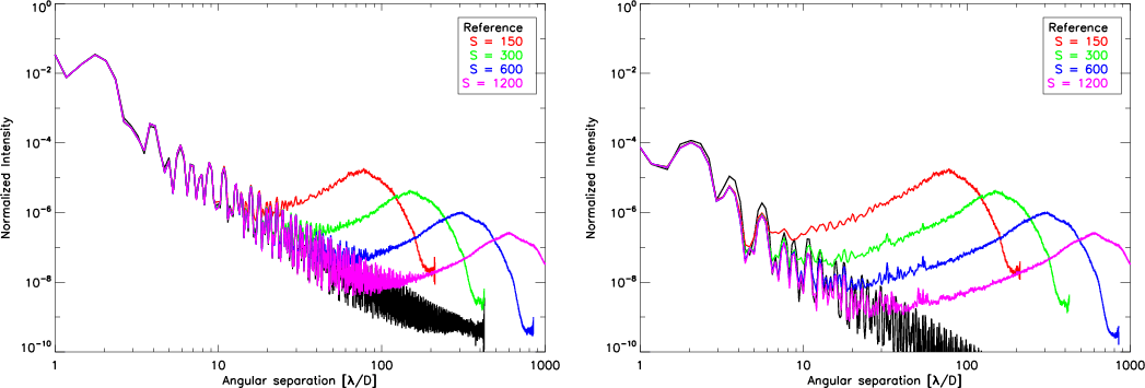 We first analyze how the dot size affects the apodized PSF (Fig. 3, left) and the coronagraphic PSF (Fig. 3, right) with respect to an ideal, continuous apodizer. The intent of these simulations is to derive relevant information about S and specify this pattern by preserving from noise, low and mid-range frequencies that are critical to coronagraphy. Since the APLC combines a conventional Lyot-type design with pupil apodization to shape the intensity in the Lyot plane, the specification of S must be tackled at the level where the coronagraphic effect appears, i.e. in the coronagraphic images.