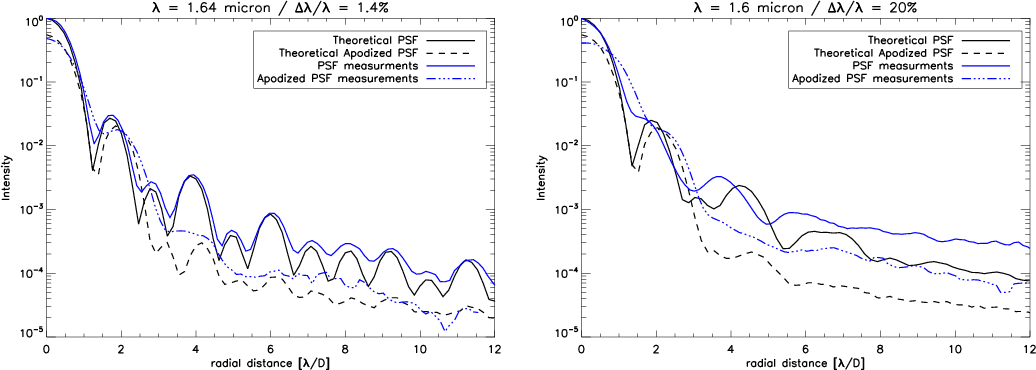 Left: PSF and apodized PSF recorded on the bench (blue lines) compared to theoretical ones (black lines) with narrow H filter