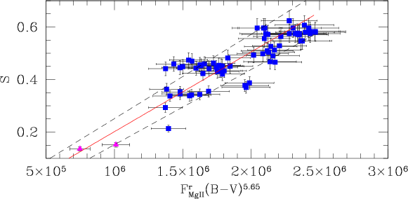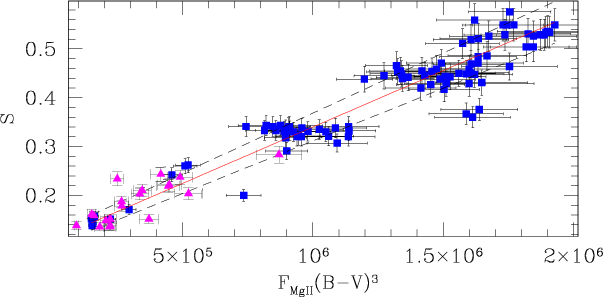 As mentioned before, the Mg II line-core fluxes can be considered as an activity indicator only in late-type stars, where the line-core emission is remarkably larger than the contribution of the continuum nearby. Therefore, we reduced our set of calibration stars to those with B-V>0.65, listed in Table 1.