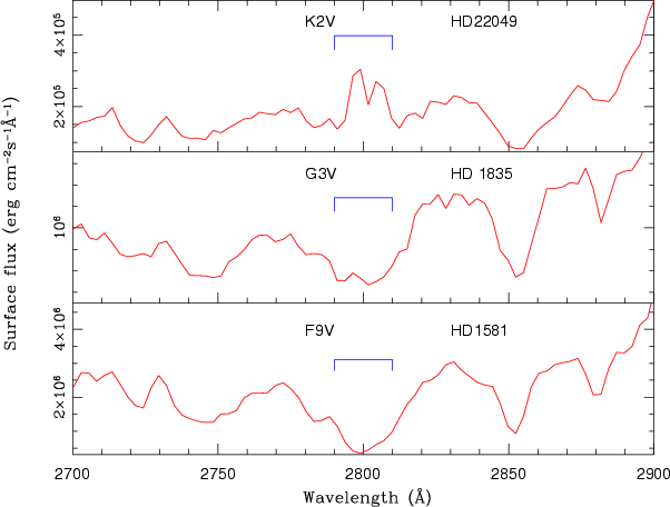Figure 2: IUE low-resolution spectra of three representative stars: HD 22 049 (K2V), HD 1835 (G3V) and HD 1581 (F9V). Surface flux is obtained according to Eq. (1). The windows used to integrate the line-core emission (2790-2810 Å) are marked on each spectrum. |