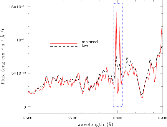 In Fig. 3 we plot two quasi-simultaneous rebinned and low-dispersion spectra of the star HD 22 049 (K2V). We can see that both spectra are similar but not equal. However, the Mg II line-core fluxes integrated between 2790 and 2810 Å (dotted rectangle) on both spectra only differ by 1-2%. Therefore, in order to calculate the Mount Wilson index from the IUE spectra, we can consider the low-resolution and the rebinned spectra indistinguishable.