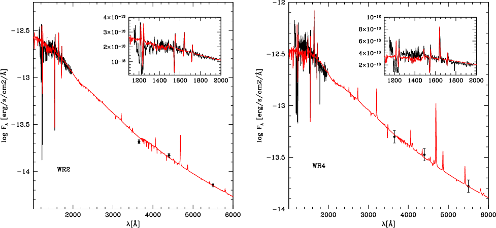SED fitting for SMC-WR2 (left panel) and SMC-WR4 ( right panel). The IUE spectra are reported as well as the fluxes in the UBV bands.