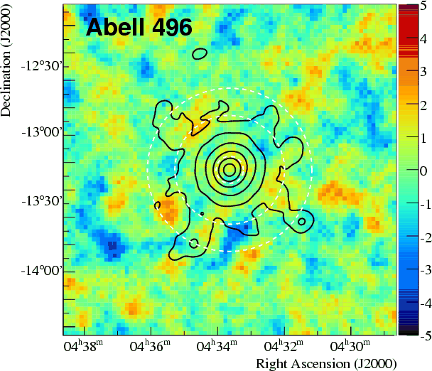 Abell 496 is a nearby (z = 0.033) relaxed cluster that features such a cooling core at its center. It also shows cold front substructures (Dupke & White 2003). Cold fronts are sharp edges in the X-ray surface brightness that are inconsistent with the appearance of shock fronts. In the case of Abell 496, the cold fronts are likely to be caused by the oscillation of the central galaxy around an equilibrium position, since the chemical abundance of the ICM is flat across these structures (Dupke & White 2003). The absence of a jump in the abundance suggests that material at both sides of the front is of the same origin and hence the cold front is not caused by a sub-cluster merger.