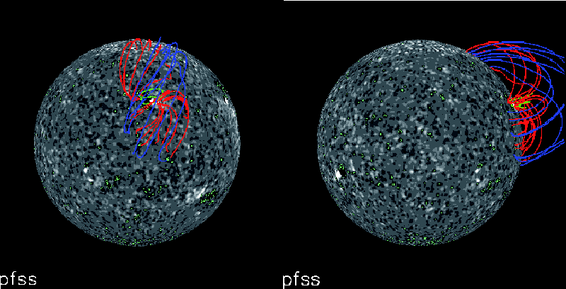 Figure 1: Magnetic field lines extrapolated using the pfss/SSWIDL package and plotted over magnetograms obtained by MDI/SoHO. The field lines showing the different magnetic field domains are drawn in different colours. The green ones show the link between the main magnetic polarities in the active region. The red ones have one footpoint in the active region and the other one far from it. The blue ones have both footpoints close to the red magnetic field line footpoints farthest from the active region. All the magnetic field lines drawn here define the large scale magnetic field topological domains of the Sun prior to the coronal wave. The two pannels show the same magnetic field lines but in the left panel they are presented from the same point-of-view of the coronal wave and in the right panel they are presented from the side. |