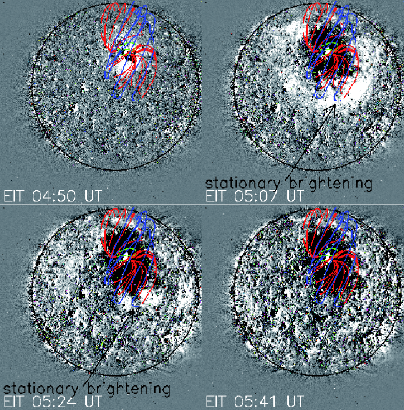 I note that stationary brightenings appear during the passage of the coronal wave (Fig. 2). They remain bright for more than 17 min but less than 34 min. One, described in Thompson et al. (1998), is located at the border of the coronal hole; the other one is in the southern hemisphere close to the equator (shown by the arrow in Fig. 2). Both stationary brightenings lie inside the layer separating two domains of magnetic field line connectivity, indicated by the red and blue magnetic field lines.