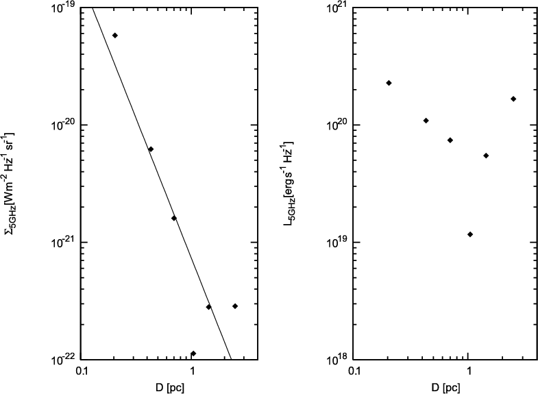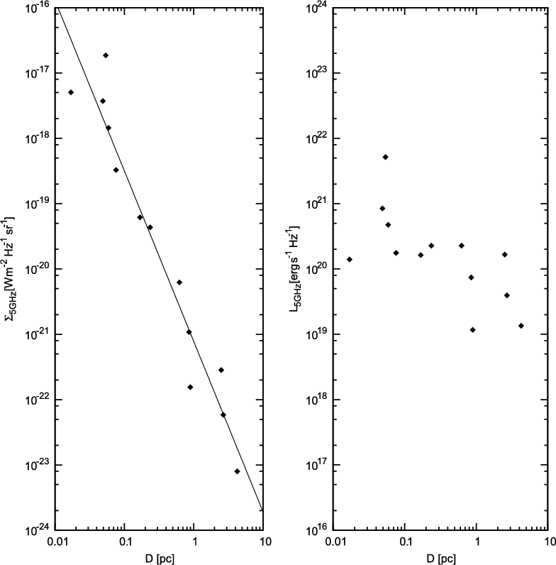 of decreasing radio surface brightness with increasing diameter