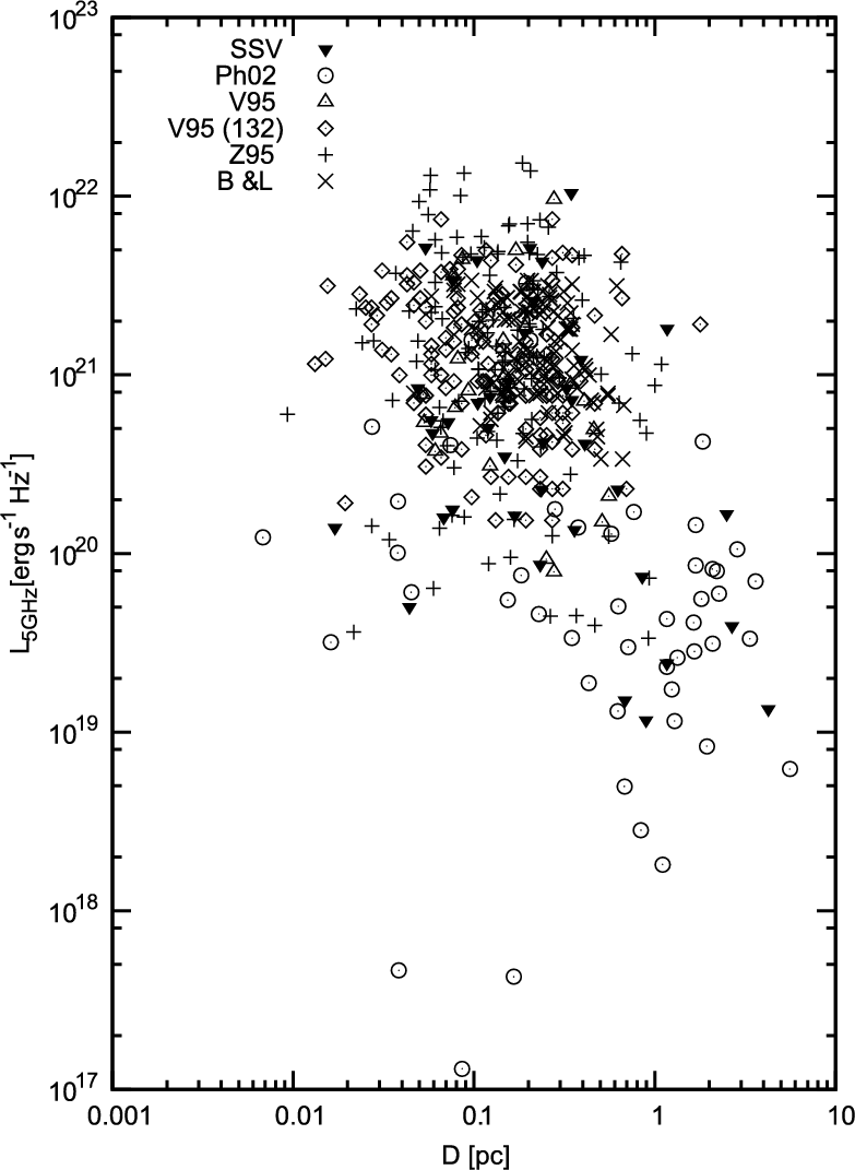 (d>2 kpc) are probably the result of Malmquist bias. However, we extracted one useful nearby SSV subsample (d<1 kpc, set 1 in Table 1). This updated sample consists of PNe with reliable and individually determined distances. A reasonable L-D dependence does exist for this nearby sample. Since this sample consists of only 13 morphologically different PNe, the