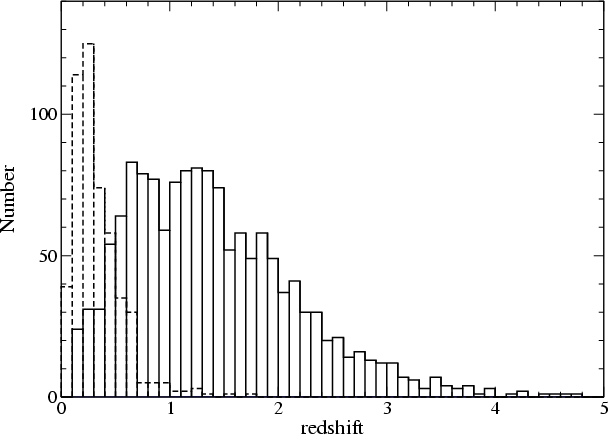 Figure 2: The redshift distributions of BL Lac objects, including candidate sources (dashed histogram) and of FSRQs (solid line histogram) reported in the Roma-BZCAT. |
