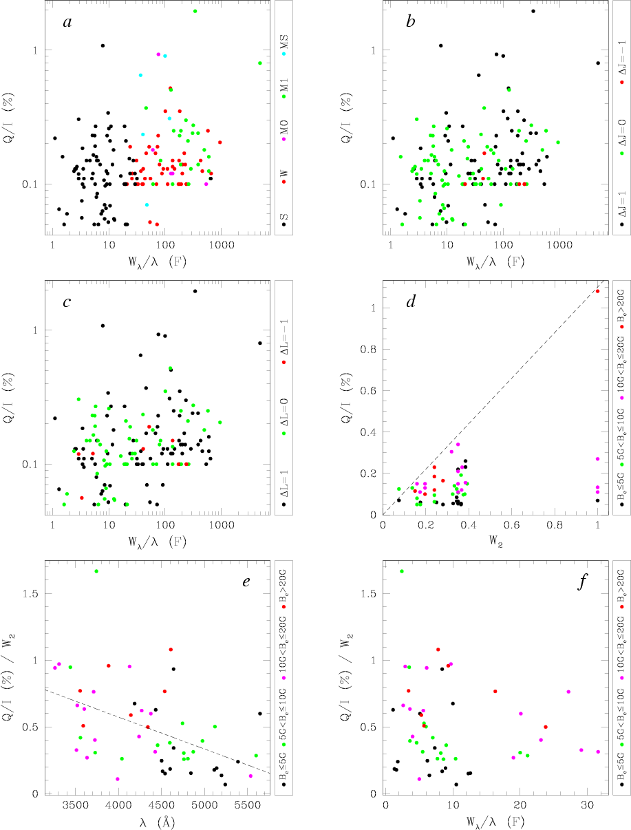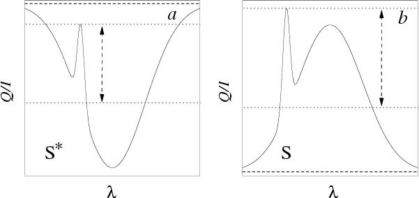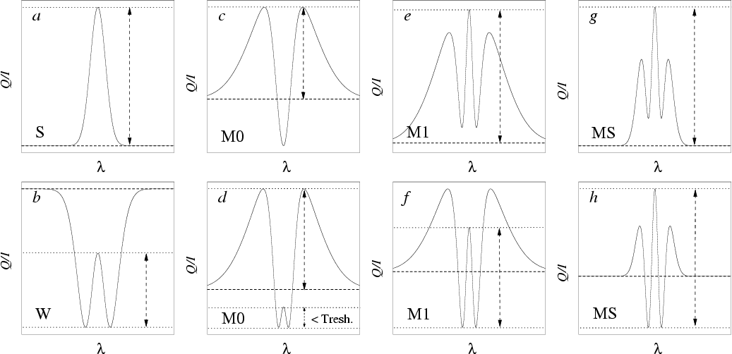 Figure 1: Classification scheme of the Q/I profiles. The thick dashed horizontal line represents the continuum level. The vertical dashed line joins the limits between which the amplitude of the signal has been measured. |