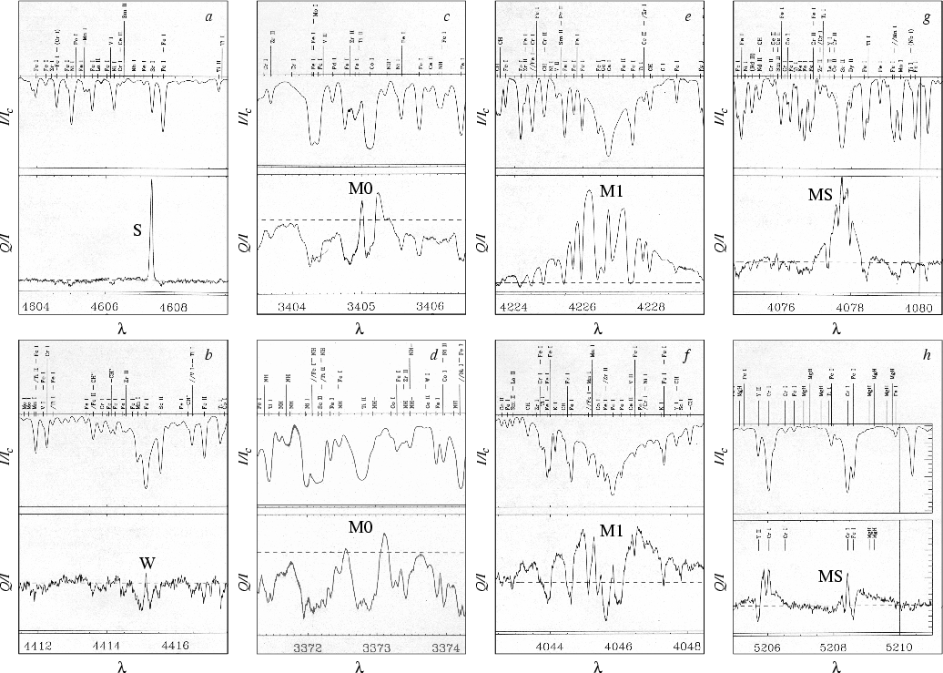 Figure 2: Examples of signals of the second solar spectrum belonging to the various classes proposed. Panel a): Sr I at 4607 Å (S signal); panel b): Fe I at 4415 Å (W signal); panels c) and d): Co I at 3405 Å and Ti II at 3373 Å (M0 signals), panels e) and f): Ca I at 4227 Å and Fe I at 4046 Å (M1 signals); panels g) and h): Sr II at 4078 Å and Cr I at 5208 Å (MS signals). The observations shown in this figure have been scanned from the atlas ``The Second Solar Spectrum'' (Gandorfer 2002,2005,2000). |