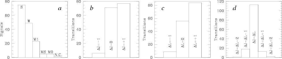 We divided all the selected signals into three main classes, according to the shape of the Q/I profile. The signals which show a Q/I profile with a single peak at line center have been classified as ``S'' signals (see Fig. 1, panel a), those which depolarize in the wings, and produce a narrow peak at line center have been classified as ``W'' signals (see Fig. 1, panel b), while those that polarize in the wings, show a decrease of the polarization amplitude approaching to the line-core and, eventually, show a narrow peak at line center have been classified as ``M'' signals. The ``M'' signals have been further divided into three subclasses, according to the presence or not of the line-core peak, and according to the relative width of the wing-lobes with respect to the line-core peak (if present). The ``M'' signals which do not show any polarizing peak at the line-core (or that show a weak line-core peak, with an amplitude below the threshold value) have been classified as ``M0'' (see Fig. 1, panels c and d), those which show in the wings polarization lobes much broader than the line-core peak have been classified as ``M1'' (see Fig. 1, panels e and f), while those which show in the wings polarization peaks whose width is similar to, or smaller than, the width of the line-core peak have been classified as ``MS'' (see Fig. 1, panels g and h). As far as ``M1'' and ``MS'' signals are concerned, our classification scheme does not take into account whether the line-core peak exceeds or not the continuum level or the wing-lobe amplitude. We have to remark that the classification of the signals through these criteria can be quite ambiguous in some cases. However, we believe that the scheme presented in this paper can be considered as a good starting point to organize in a few significative classes the wide variety of polarimetric signals that are found in the second solar spectrum. Examples of signals of the second solar spectrum belonging to the various classes proposed can be found in Fig. 2.