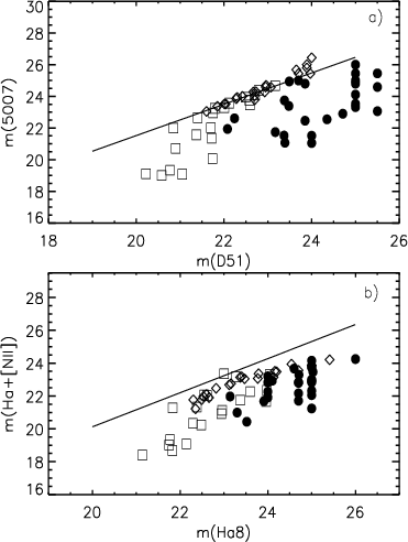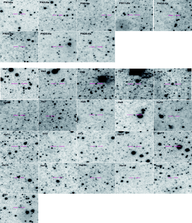 - Using several criteria to distinguish between different types of line emission objects, we detected 26 PN candidates (8 more than the previously known sample), many compact HII regions and some H