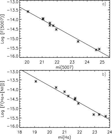 + [N II] magnitudes derived from the imaging were calibrated using results from our spectroscopy. This allowed us to determine calibrated apparent [O III] 5007 and H
