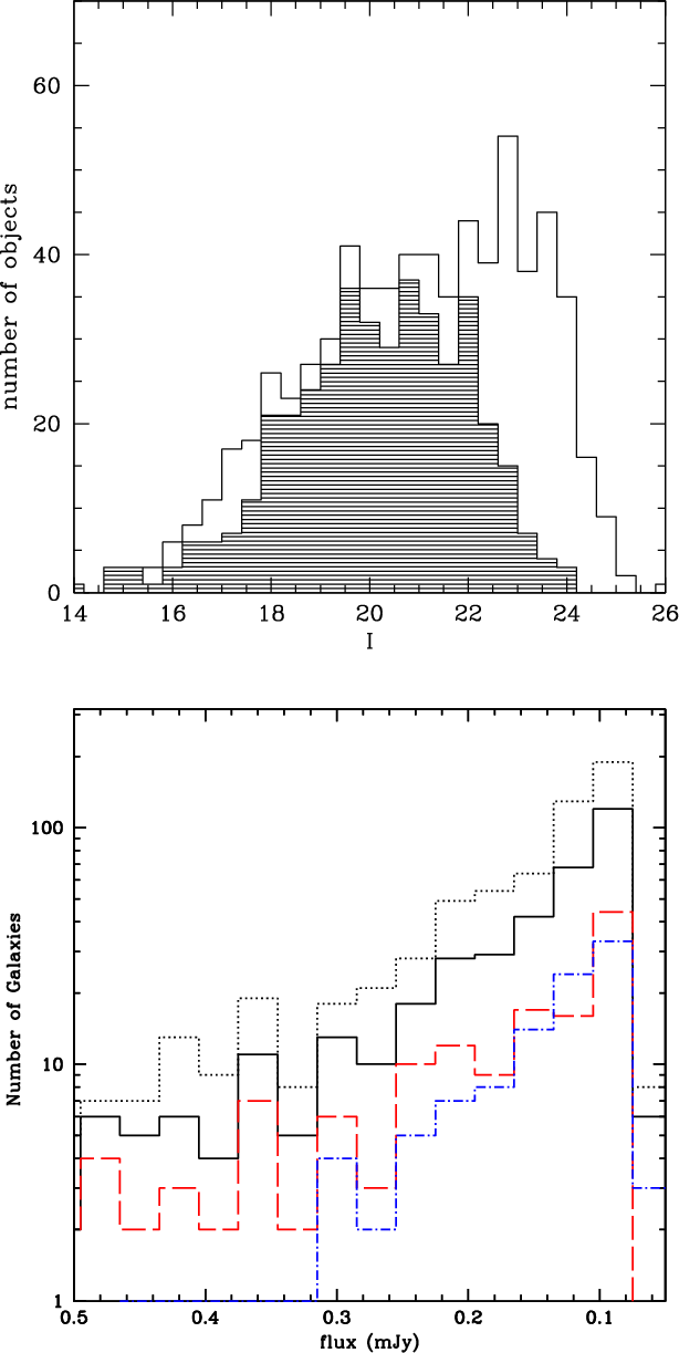 Deep 1.4 GHz counts exhibit an upturn below a few millijansky (mJy), which corresponds to a rapid increase in the number of faint sources (Windhorst et al. 1985). First results of the spectroscopic follow-up of relatively bright counterparts (B<22) identified many of them as blue galaxies with spectra showing evidence of intense star formation (Benn et al. 1993; Franceschini et al. 1988). However, with increasing depth of the optical follow-up programs, it resulted that an increasing number of sub-mJy sources was associated with earlier type galaxies (Gruppioni et al. 2003; Prandoni et al. 2001; Hammer et al. 1995; Afonso et al. 2006).