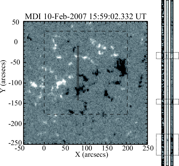 Figure 2: SOHO MDI longitudinal magnetograph taken at 15:59:02 UT on 2007 February 10. The caption is the same as Fig. 1. Three rectangles with dotted line in slot images show the area that is dominated by persistent strong vertical magnetic flux concentrations for the plage region, and is masked for the analysis. |