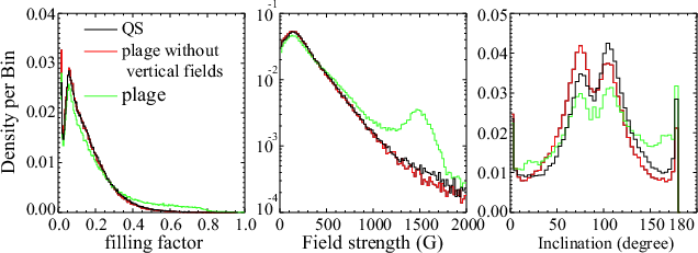 Figure 5: Filling factor ( left), magnetic field strength ( middle), and inclination ( right) probability density functions (PDFs). The black, green, and red lines represent the quiet Sun, the plage region, and the plage region excluding the area with persistent vertical fields. |