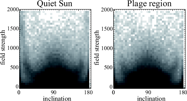 ). Vertical field distributions (Fig. 7, left) in both quiet Sun and plage regions extend to higher magnetic fields (B >