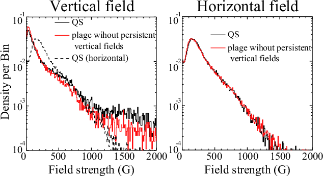 1000 Gauss) compared with horizontal magnetic fields represented by the black dashed line in Fig. 7, left. We see that quiet Sun has a somewhat higher distribution towards above 500 G than the plage region. This is likely caused by network fields in the quiet Sun, which are not removed. The same effect is seen in the PDF of field strength for the quiet Sun and the plage region without vertical fields (Fig. 5, middle).